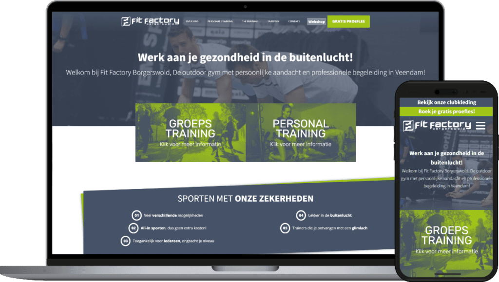 De website is volledig mobielvriendelijk en SEO-geoptimaliseerd, zodat Fit Factory Borgerswold goed vindbaar is in zoekmachines en eenvoudig toegankelijk is op alle apparaten. Dankzij de snelle laadtijden en intuïtieve navigatie vinden bezoekers moeiteloos de informatie die ze zoeken.