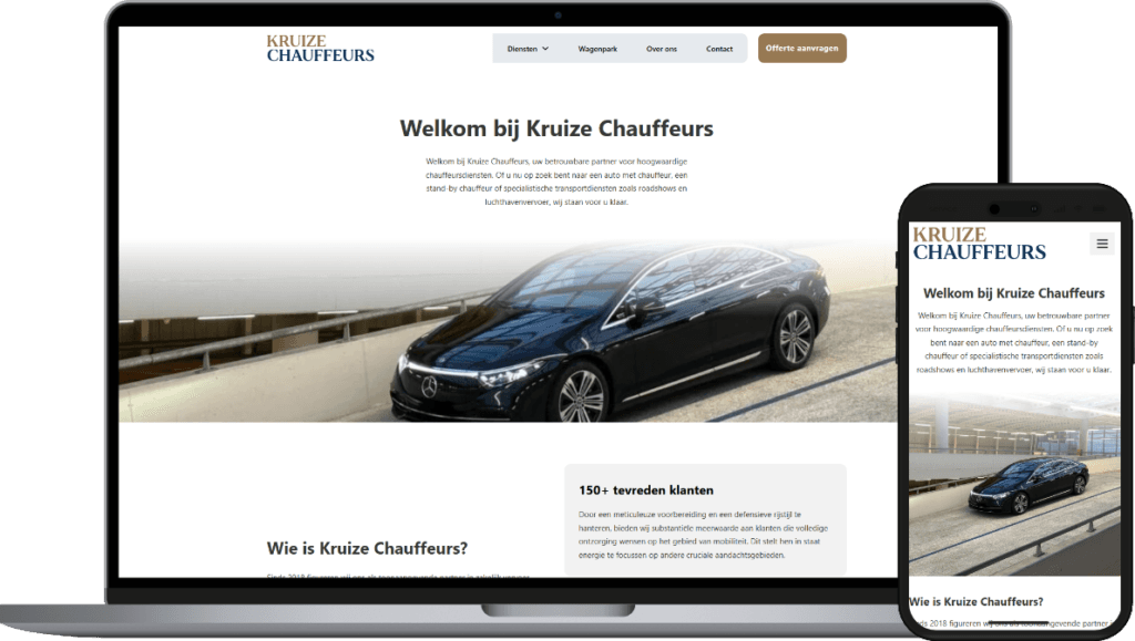 Voor Kruize Chauffeurs, een nieuw premium chauffeursdienstbedrijf, hebben we een moderne en professionele website ontwikkeld die perfect aansluit bij de exclusieve service die zij bieden. Omdat het bedrijf nieuw is, hebben we vanaf de basis een sterke online aanwezigheid gecreëerd met een focus op luxe, betrouwbaarheid en gebruiksgemak.