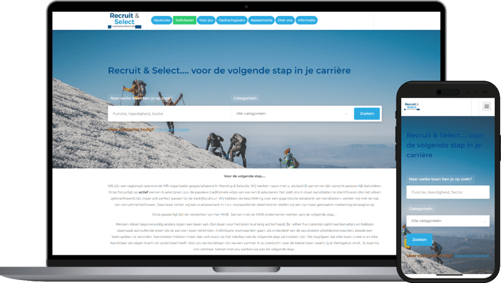 Voor Recruit & Select hebben we een moderne en professionele website ontwikkeld die perfect aansluit bij hun expertise in werving en selectie. Met deze nieuwe online omgeving wordt het eenvoudiger dan ooit voor zowel werkgevers als werkzoekenden om elkaar te vinden.